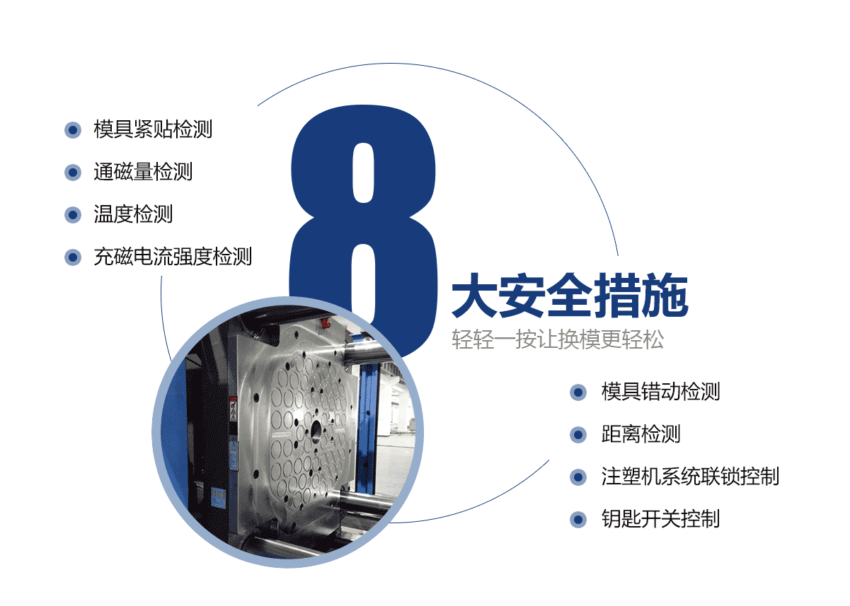 • 電永磁磁力模板只需一名操作員,無需其他工具,就可以在距注塑機安全距離的磁力系統上執(zhí)行操作。 大大降低人工成本和勞動強度。